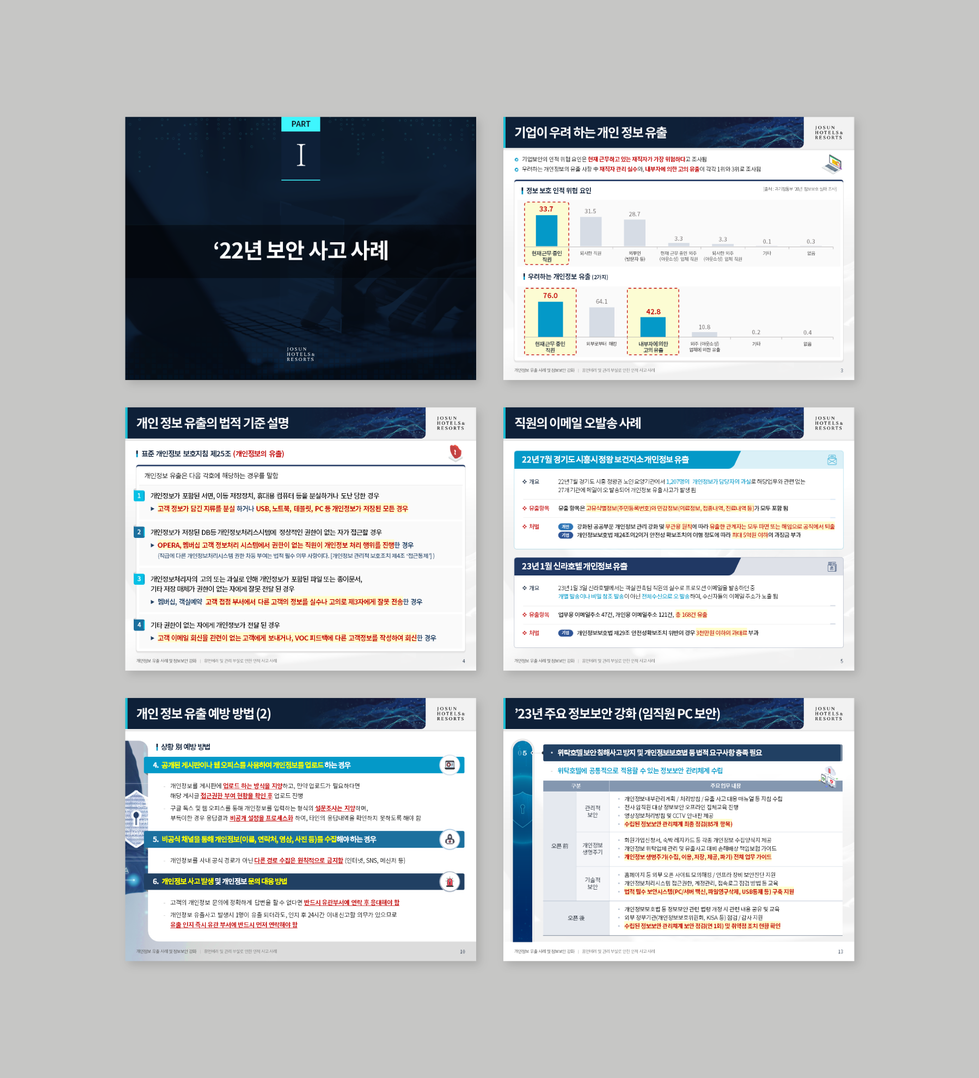 기업 내부적으로 사용할 정보보안 강화 보고서 PPT 입니다.개인정보 유출을 방지하고 정보보안을 강화하기 위해다양한 사례와 법적 근거를 들어 중요함을 강조하는 자료입니다.
